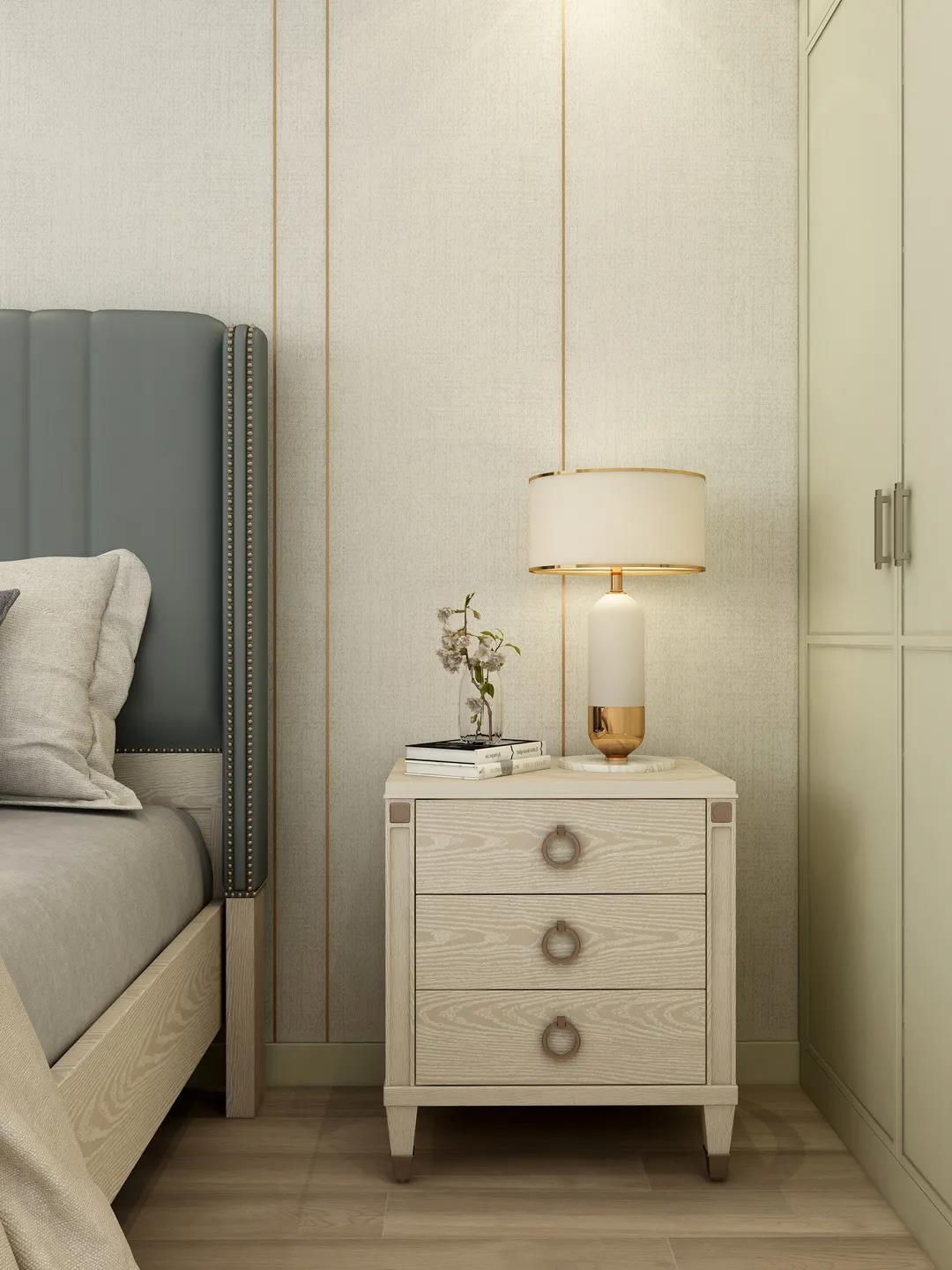 次卧背景墙两端是对称式设计,以淡雅的暖色为主,